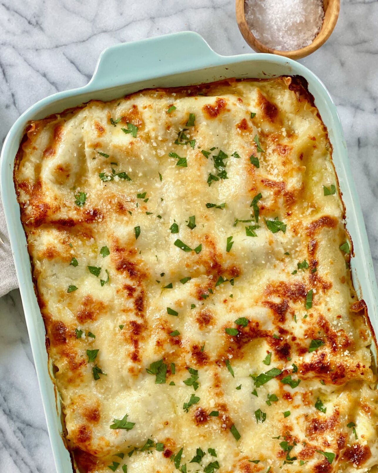 The white sauce used in this lasagna is bechamel. It’s thick and incredibly creamy, although not too rich or heavy. Bechamel is one of the five building-block sauces in French cuisine, and is made with a roux (equal parts butter and flour) mixed with milk, and seasoned with salt, pepper, and often a pinch of ground nutmeg.